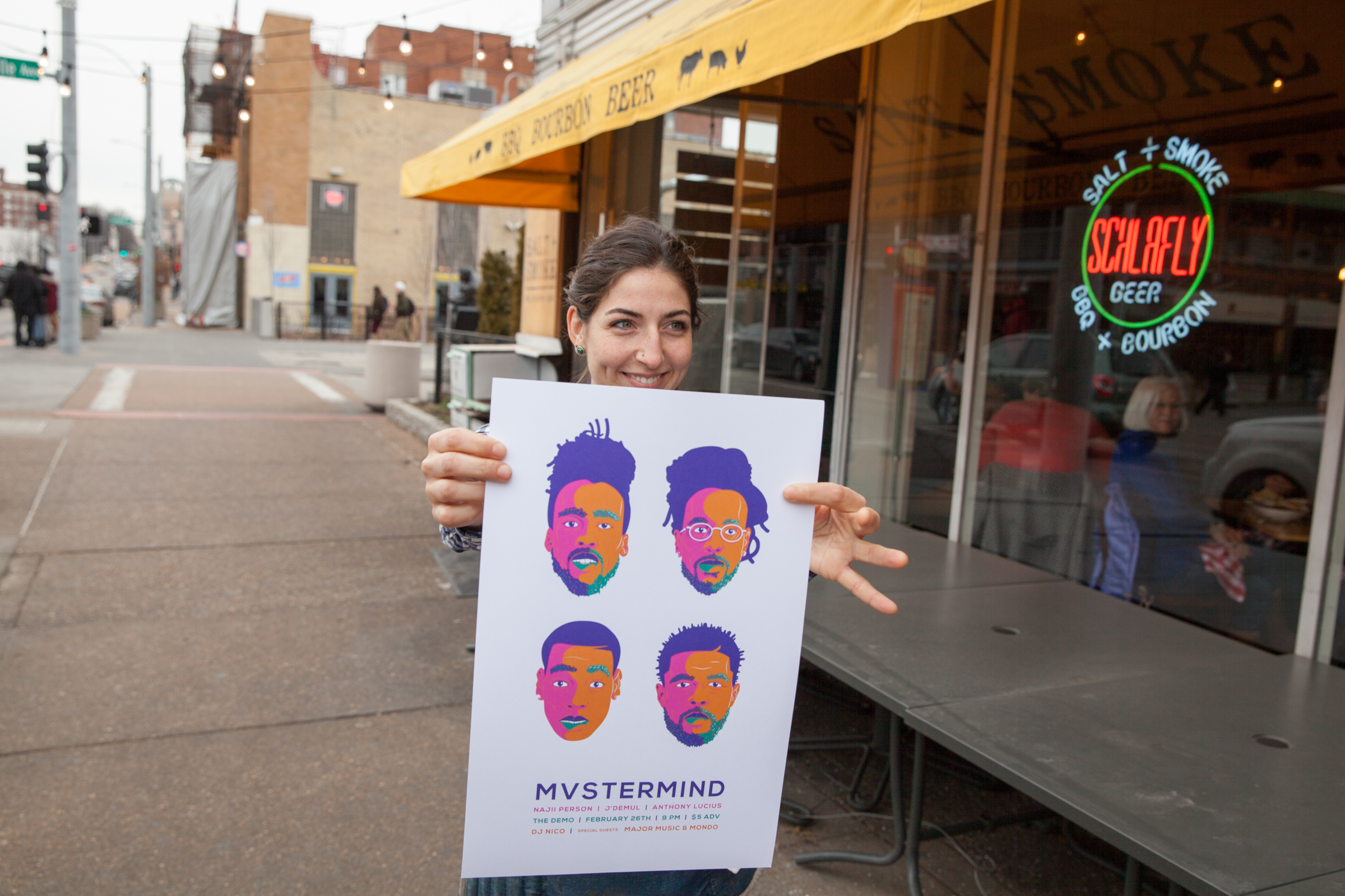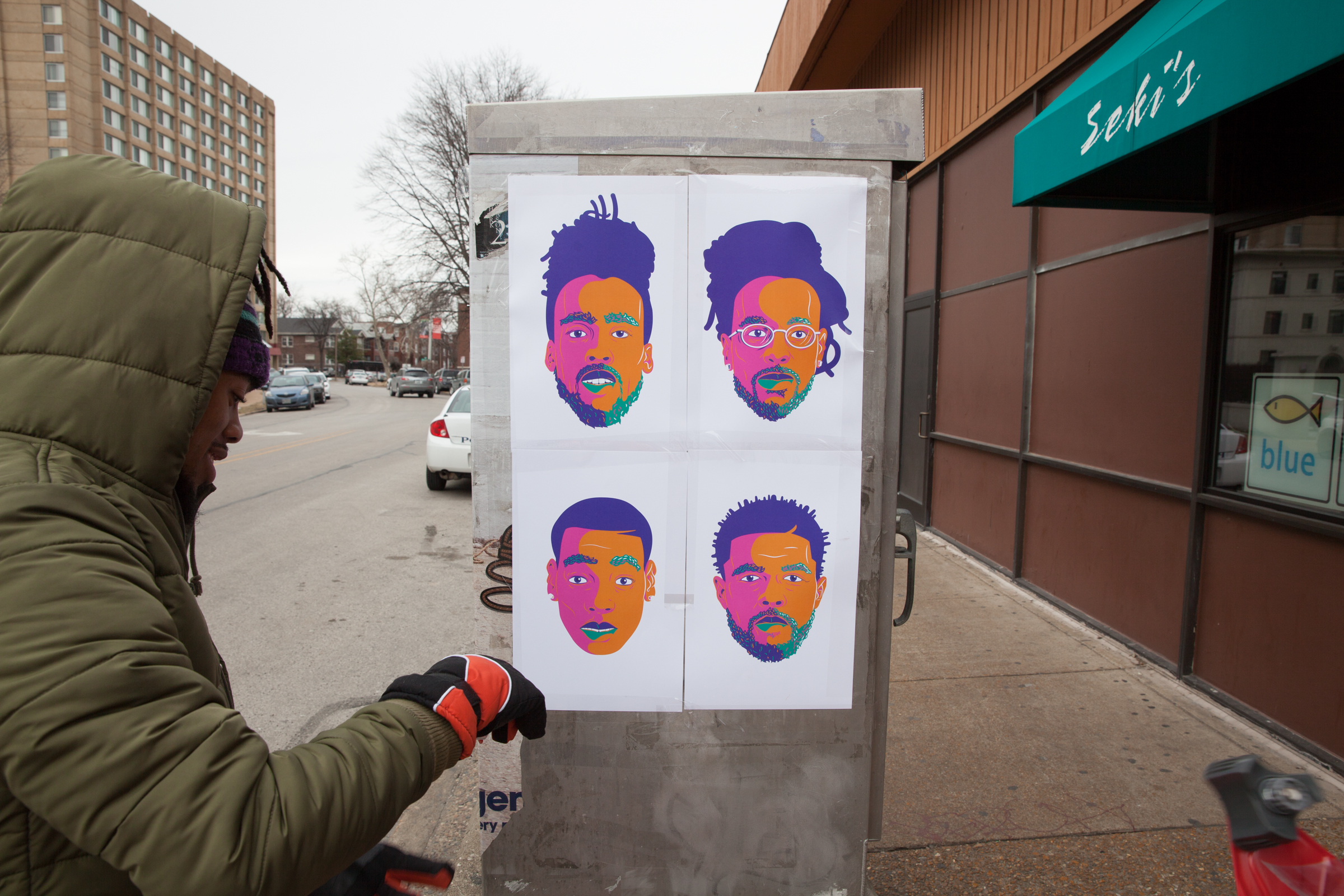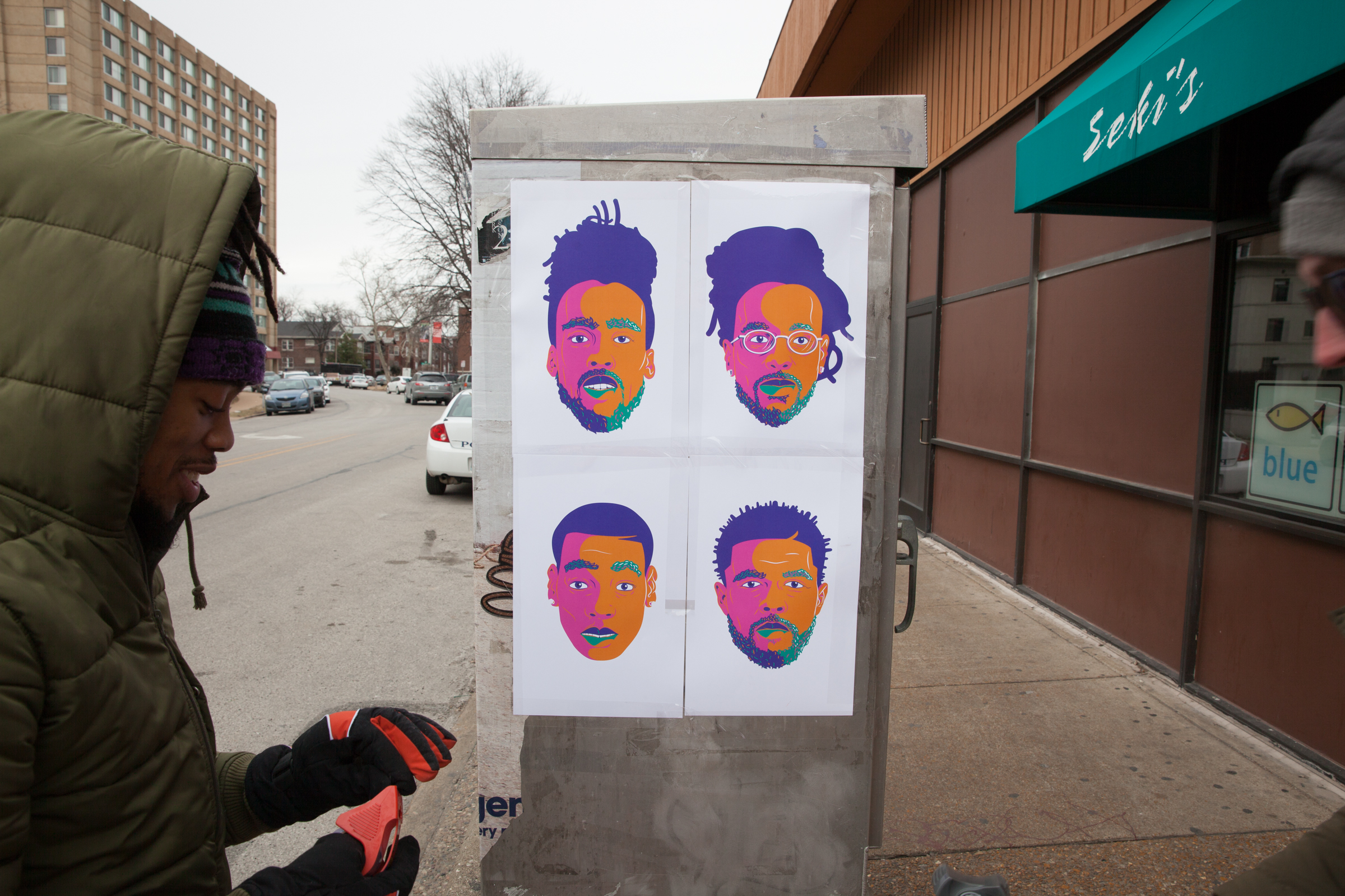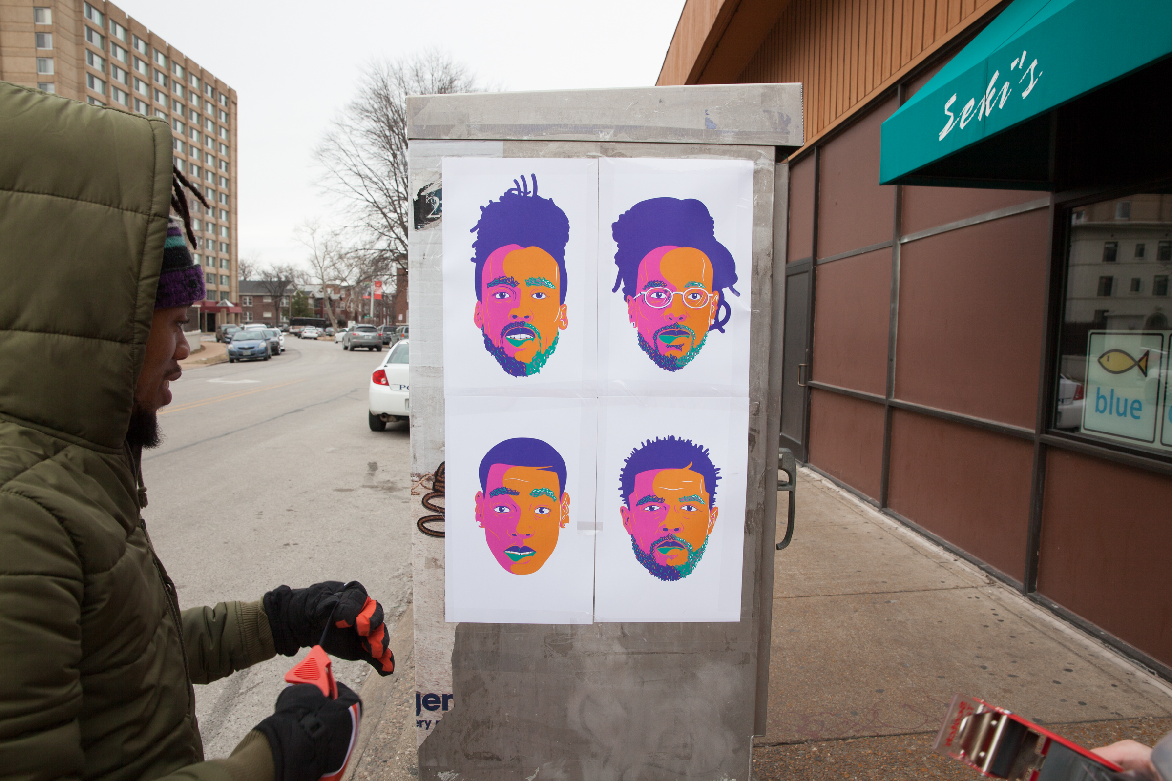 When the primary objective of a project is to simply help others, the outcome of such efforts are limitless. With an emphasis on the creative mind, Exist Magazine set out to document an unlikely collaboration between some of Saint Louis’ finest hip-hop innovators and artist / designer Gregory Davis in a public art project to promote a show at The Demo on February 26th. You might have noticed the many faces posters hung up around Saint Louis. A grid of four faces in orange, pink, purple, and teel hung up from Saint Louis Delmar Loop to South City Cherokee Street. The posters depict the cast for friday nights show starting with the headliner Mvstermind, along with Najii Person, J’Demul, and Anthony Lucius. Hanging up posters to promote a show is nothing new, but you may have noticed that these posters were a bit different. The posters were void of any information. The idea grew from a conversation about the abuse of information constantly bombarding the living world. The intention was to promote online, and have the public art to simply exist as art. Since the posters were hung they’ve taken on a life of their own. Fans have brought the project to greater heights by posting and tagging themselves in pictures via social media. Friday, February 26th will conclude the efforts to make a night that Saint Louis will never forget. The show starts at 9pm, and tickets are only $5 if you buy them in advance. We will see you there!